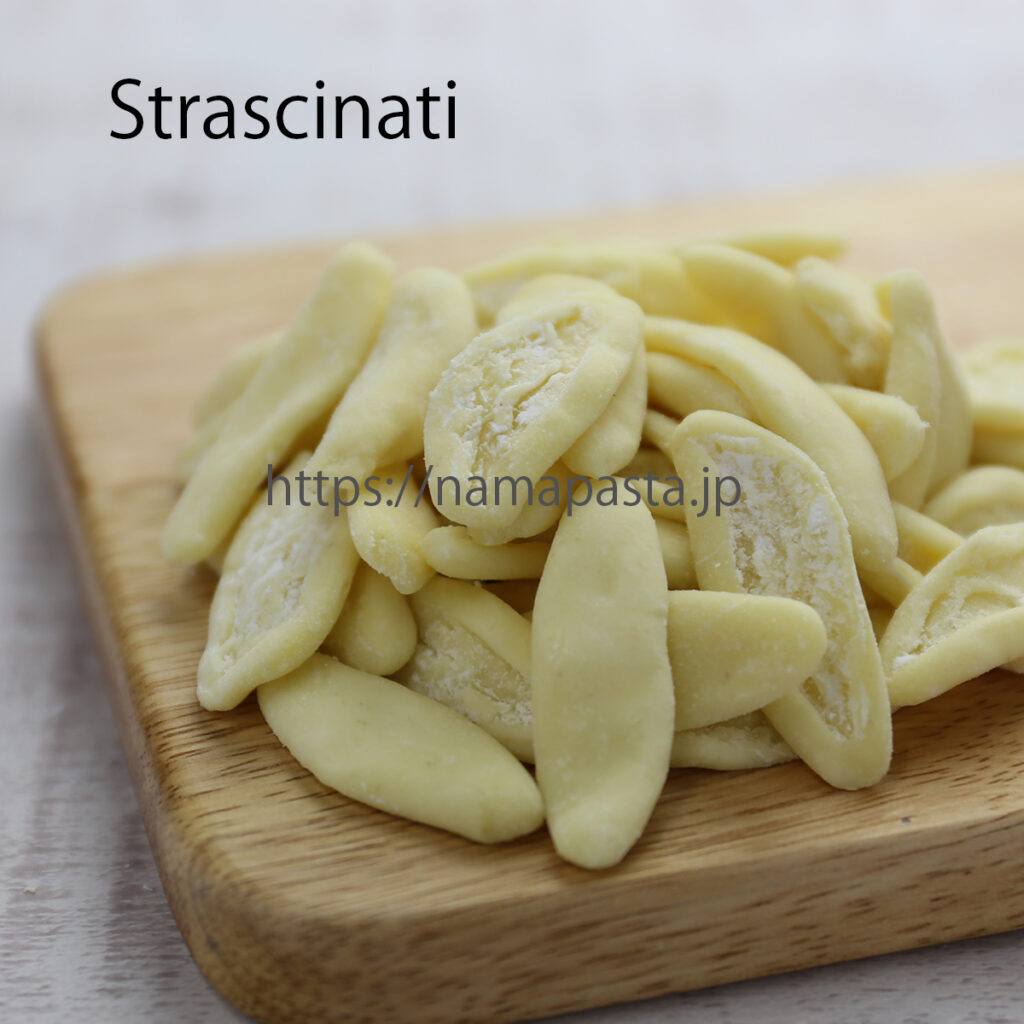 南イタリア プーリア州など南部で食されるパスタ。「ひきずる」とか「伸ばす」という意味。形は平たく葉っぱのような形で長さは5cm前後、しっかりした食感です。